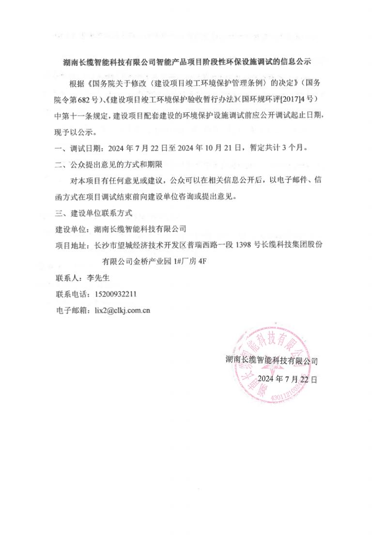 湖南長纜智能科技有限公司智能產(chǎn)品項目階段性環(huán)保設施調(diào)試的信息公示