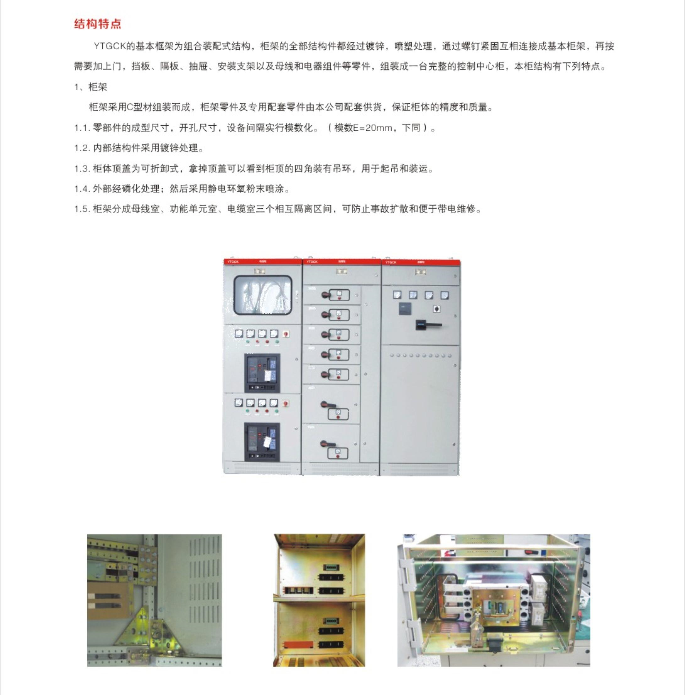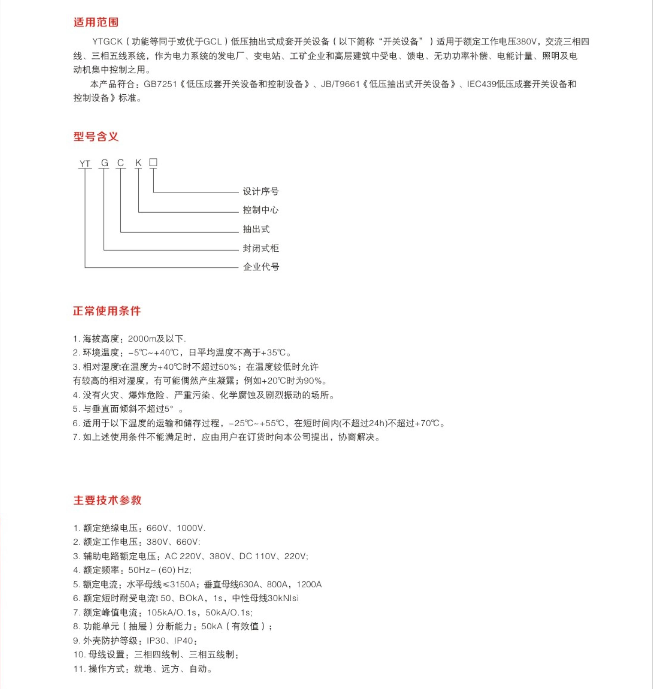 YTGCK (功能等同于或優(yōu)于GCL )低壓抽出式成套開(kāi)關(guān)設(shè)備(以下簡(jiǎn)稱“開(kāi)關(guān)設(shè)備”) 適用于額定工作電壓380V,交流三相四線、三相五線系統(tǒng),作為電力系統(tǒng)的發(fā)電廠、變電站、工礦企業(yè)和高層建筑中受電、饋電、無(wú)功功率補(bǔ)償、電能計(jì)量、照明及電動(dòng)機(jī)集中控制之用。