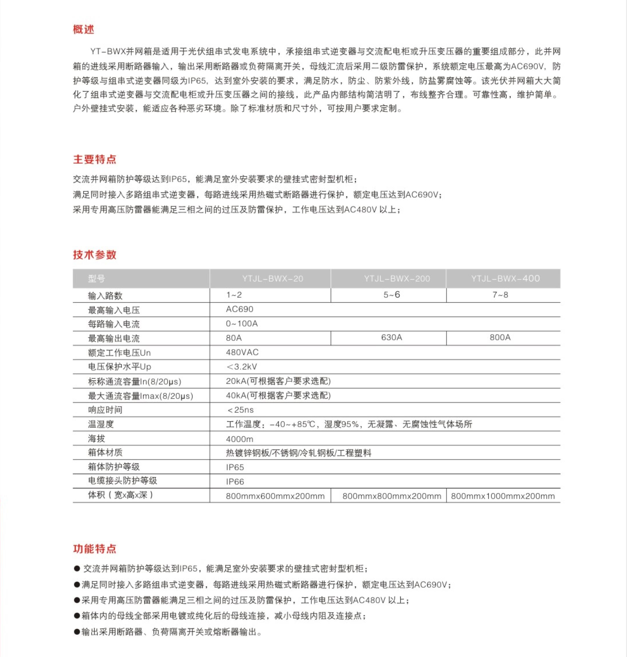 YT-BWX并網(wǎng)箱是適用于光伏組串式發(fā)電系統(tǒng)中,承接組串式逆變器與交流配電柜或升壓變壓器的重要組成部分,此并網(wǎng)箱的進(jìn)線采用斷路器輸入,輸出采用斷路器或負(fù)荷隔離開關(guān),母線匯流后采用二級防雷保護(hù),系統(tǒng)額定電壓最高為AC690V,防護(hù)等級與組串式逆變器同級為IP65,達(dá)到室外安裝的要求,滿足防水,防塵、防紫外線,防鹽霧腐蝕等。