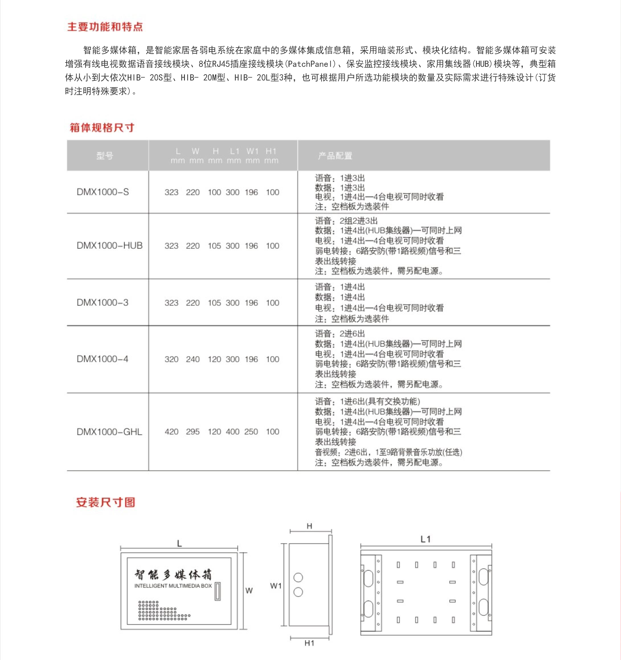 智能多媒體箱,是智能家居各弱電系統(tǒng)在家庭中的多媒體集成信息箱,采用暗裝形式、模塊化結(jié)構(gòu)。智能多媒體箱可安裝增強有線電視數(shù)據(jù)語音接線模塊、8位RJ45插座接線模塊(PatchPanel)、保安監(jiān)控接線模塊、家用集線器(HUB)模塊等,典型箱體從小到大依次HIB- 20S型、HIB- 20M型、HIB- 20L型3種,也可根據(jù)用戶所選功能模塊的數(shù)量及實際需求進(jìn)行特殊設(shè)計(訂貨時注明特殊要求)。