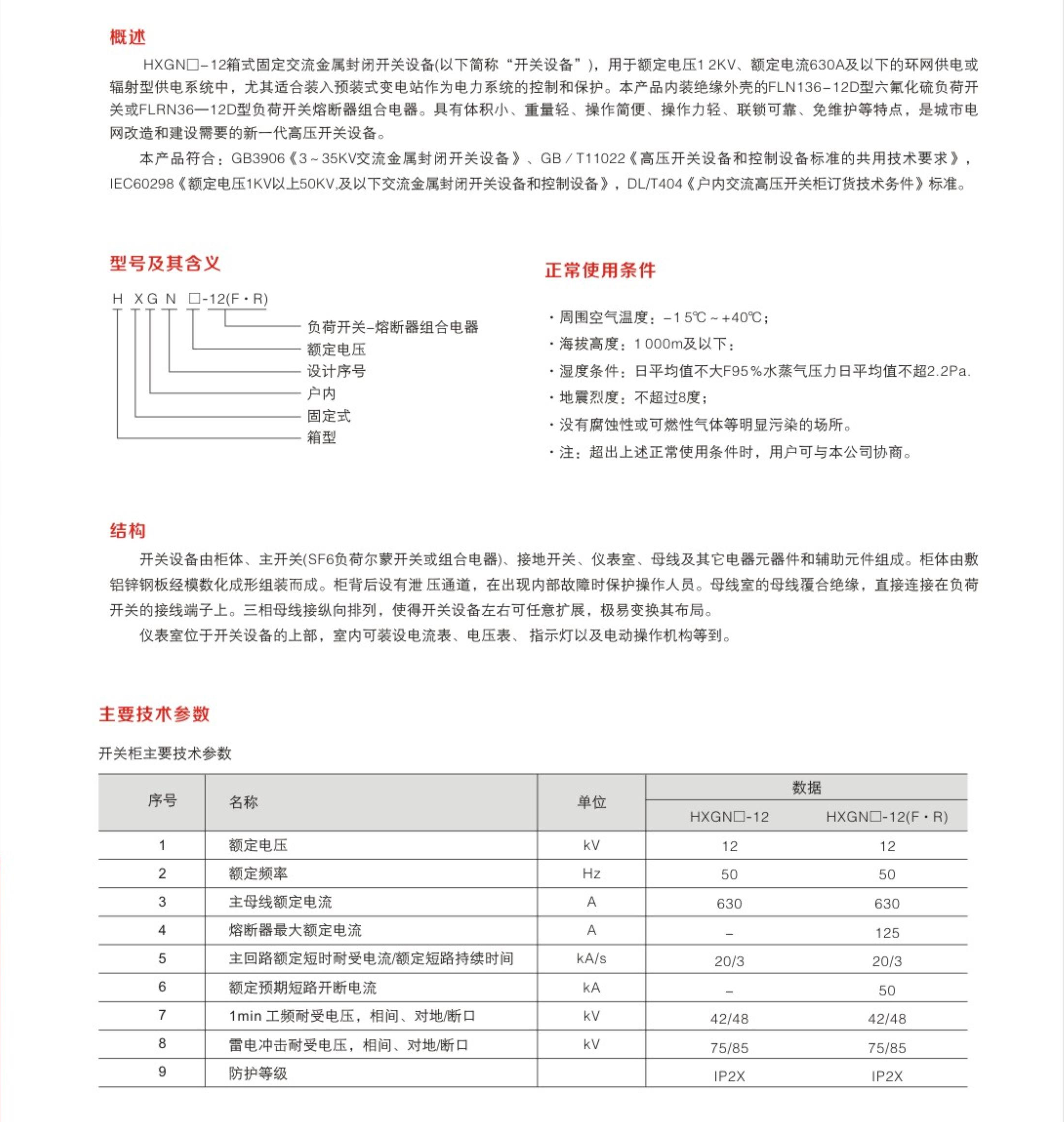 HXGN?- 12箱式固定交流金屬封閉開關(guān)設(shè)備(以下簡稱“開關(guān)設(shè)備”), 用于額定電壓1 2KV、額定電流630A及以下的環(huán)網(wǎng)供電或輻射型供電系統(tǒng)中,尤其適合裝入預(yù)裝式變電站作為電力系統(tǒng)的控制和保護。本產(chǎn)品內(nèi)裝絕緣外殼的FLN136- 12D型六氟化硫負荷開 關(guān)或FLRN36- -12D型負荷開關(guān)熔斷器組合電器。
