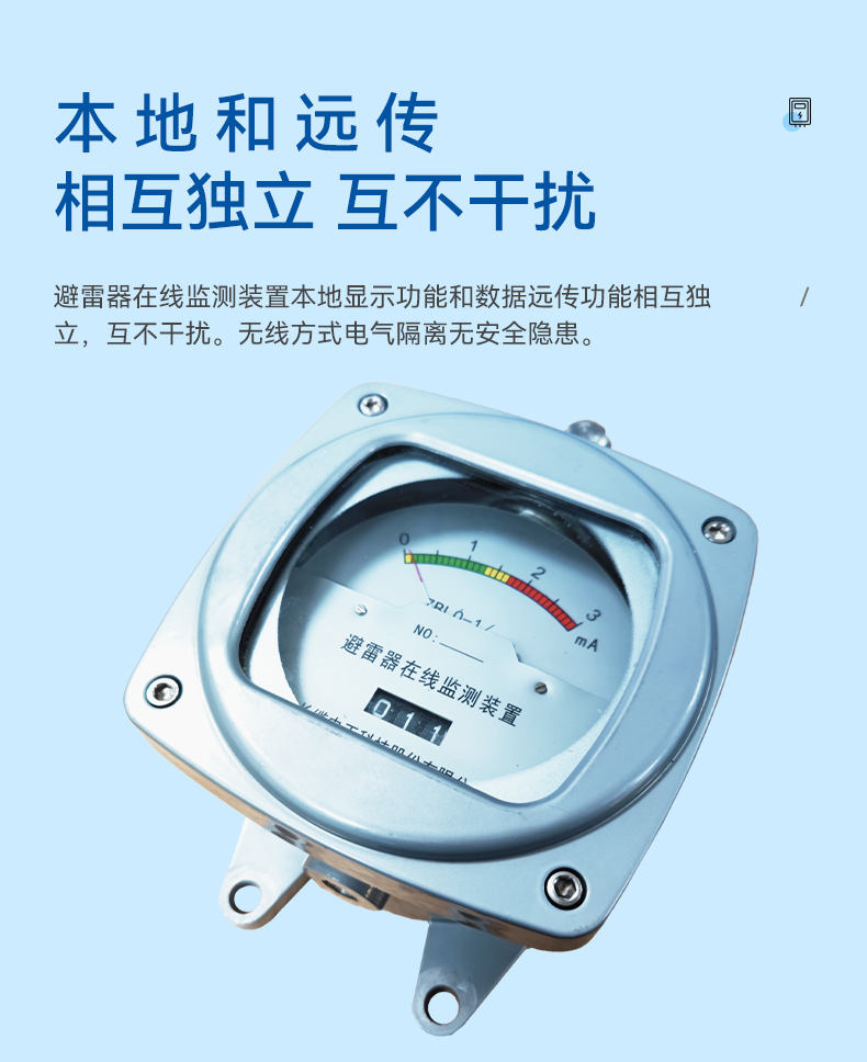 ? 避雷器在線監(jiān)測(cè)裝置本地顯示功能和數(shù)據(jù)遠(yuǎn)傳功能相互獨(dú)立,互不干擾。