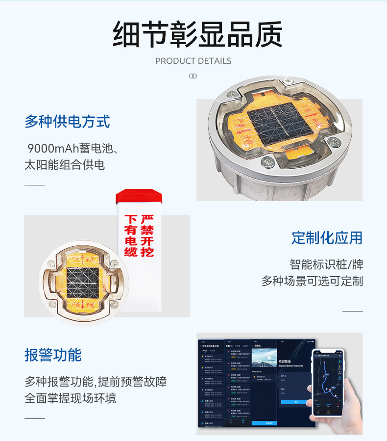 智能地釘是通過在被監(jiān)測通道上方安裝智能標識牌(樁)以及可視化視頻監(jiān)測裝置,單個智慧地釘可監(jiān)控周圍十幾米以內(nèi)的異常震動,當有例如重型機械、重型車輛、挖掘機、吊車等施工時,會產(chǎn)生的震動作用于地面。智慧地釘可立即感應(yīng)到震動,并通過內(nèi)置高性能芯片和Al算法智慧判斷風險等級,篩選有一定風險的震動生成報警信息,通過NB-iot或者Lo-Ra通信方式傳輸報警信息,同時聯(lián)動周圍攝像頭展示現(xiàn)場實時視頻,最終通過監(jiān)控大屏、web、短信和微信小程序傳輸給后臺監(jiān)控系統(tǒng)和管理人員,引導管理人員及時查看監(jiān)控確認情況或者到現(xiàn)場及時制止破壞行為,并及時關(guān)注通道安全。