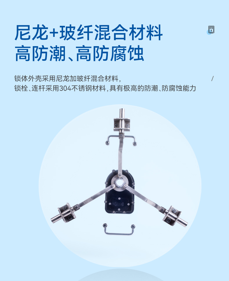 1、鎖體外殼采用尼龍加玻纖混合材料,鎖栓、連桿采用304不銹鋼材料,具有極高的防潮、防腐蝕能力;